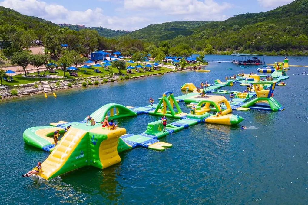 This is at the same place as the zipline park. It 's a real life oversized floating obstacle course on the lake with slides, trampoline, climbing wall, diving spots, etc. It's a ton of fun! Address is same as the zip line: 14529 Pocahontas Trail Leander, TX 78641